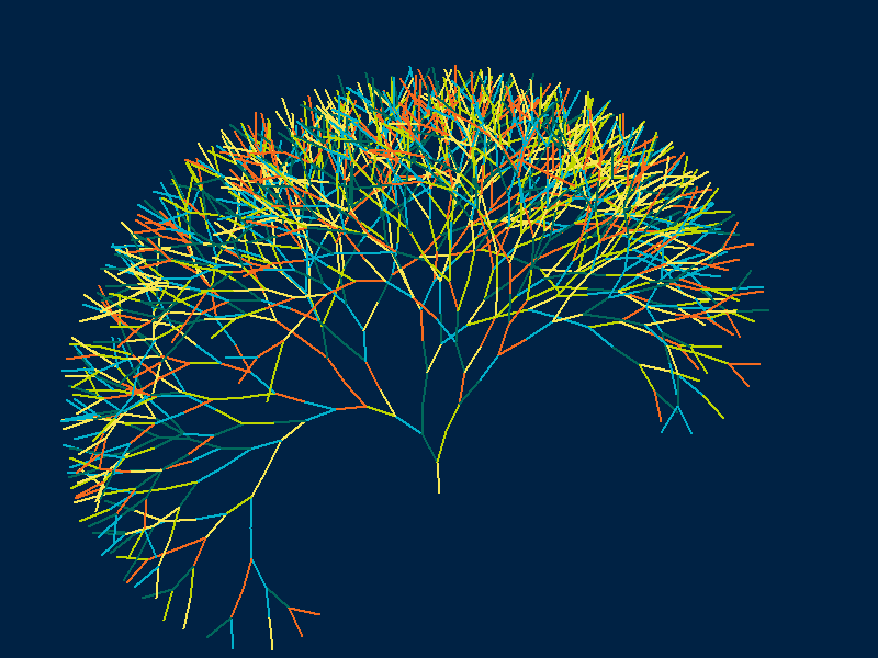 fibTree(turtle,length,angle,level,colors,True,maxflex)